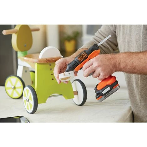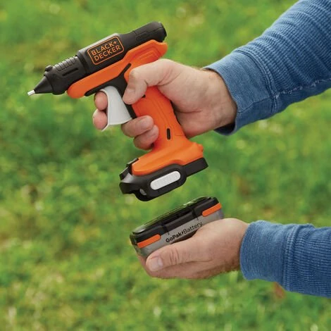 L’ergonomie et le faible poids du pistolet à colle BDCGG12S1-QW BLACK+DECKER garantissent une excellente maniabilité. Sa poignée principale est recouverte d’un grip et dispose d’une large gâchette permettant d’adapter le débit de colle avec précision.Avec un temps de chauffe de moins d’une minute, vous pourrez commencer à travailler rapidement sur la quasi-totalité des supports. Le pistolet à colle BLACK+DECKER convient pour de nombreux matériaux comme le carton, le plastique, le métal, textile, bois, cuir ou encore le verre. Il est idéal pour tous les travaux de bricolage et de loisirs créatifs tels que le scrapbooking ou les petites réparations quotidiennes comme fixer une plinthe ou une moulure. Pour plus de polyvalence, le pistolet à colle fonctionne avec des bâtons de colle standard de 7 mm que l’on retrouve facilement dans les grandes surfaces de bricolage. Pour offrir toujours plus de sécurité à l’utilisateur, BLACK+DECKER a équipé son pistolet à colle d’un témoin LED. Lors de la mise ne marche, le témoin clignote et devient fixe quand l’outil est prêt à l’emploi. De plus, en cas de non-utilisation prolongée, l’outil s’arrête automatiquement. Le pistolet à colle BLACK+DECKER BDCGG12S1-QW intègre la plateforme 12V SYSTEM, une gamme d’outils pour le bricolage et la décoration fonctionnant avec une batterie 12 V Lithium-Ion. Cette batterie permet à la fois d’alimenter les outils de la plateforme 12V, mais également de se transformer en chargeur ultra-rapide pour tous vos appareils électroniques de type smartphones ou tablettes. Le pistolet à colle est livre´ avec 4 ba^tons de colle 7 mm, 1 batterie GoPack Lithium 1.5Ah, un chargeur 1A et un ca^ble USB de charge.;;
