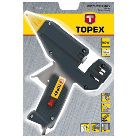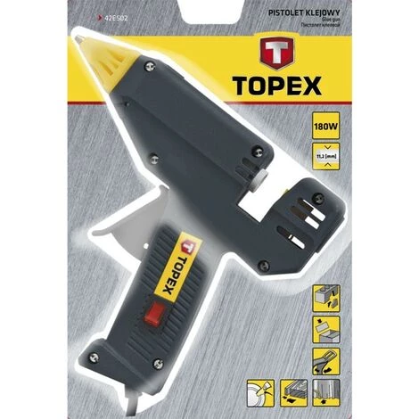 Pistolet à colle TOPEX (réf. 42E502) pour colle de diamètre 11,2 mm, puissance de 180W. Le boîtier pratique et la prise en main confortable réduisent l’effort de travail. Boîtier résistant à la chaleur. Pointe pour une application précise de la colle. Débit de colle 26-30 g/min. Parfait pour un atelier de bricolage ainsi que pour des applications professionnelles telles que la pose de tapis, la fabrication de meubles. La conformité aux normes de sécurité européennes est assurée par le certificat CE. La marque TOPEX s’adresse aux bricoleurs passionnés.