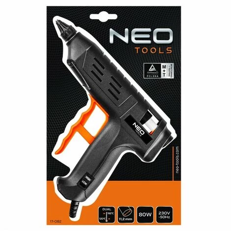 Pistolet à colle NEO (réf. 17-082) pour colle de diamètre 11,2 mm, puissance 80W. Le pistolet fait fondre la colle plus rapidement grâce à sa puissance élevée et sa température de travail. La colle se dissout 2 à 3 fois plus vite que lorsque vous travaillez avec un pistolet standard. Pistolet avec contrôle de température à deux niveaux – 120 ° C et 193 ° C. Conçu pour fonctionner avec des adhésifs spéciaux avec différents points de fusion. La haute température est utilisée pour les adhésifs recommandés pour l’assemblage des métaux, des plastiques et des céramiques. La basse température est recommandée pour les adhésifs pour assembler des matériaux textiles, des compositions florales. Gâchette longue ergonomique conçue pour réduire l’effort de travail et augmenter l’efficacité de la consommation de colle. Boîtier résistant à la chaleur. Embout métallique anti-goutte pour une application précise de la colle. Parfait pour un usage professionnel, tels que la production de meubles, la fixation de tapis. Haut débit de colle de 22 g/min. La conformité aux normes de sécurité européennes est assurée par le certificat CE. La garantie de la haute qualité et de la fiabilité du produit est le certificat TÜV Rheinland. La marque NEO répond aux attentes des professionnels.