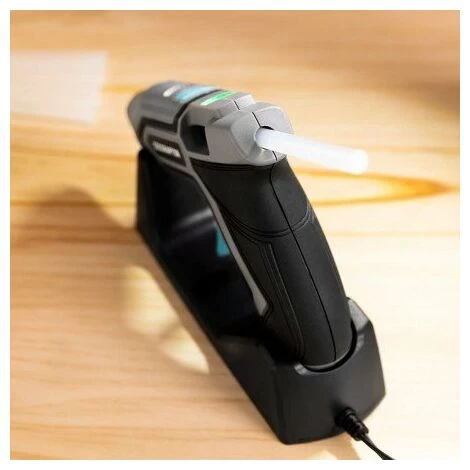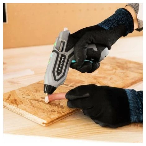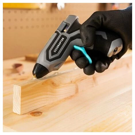 Pistola di incollaggio alimentata a batteria da 3,7 V e 1500 mAh, compatibile con barre di colla di 7 mm di diametro e 140 mm di lunghezza; tempo di riscaldamento di 90 s, spegnimento automatico dopo 10 min di inattività e autonomia fino a 30 min.