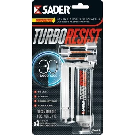 Collage instantanéColle bi-composant multi-matériaux SADER TURBO RESIST® Colle bi-composante de réparation polyvalente. Colle, répare, reconstitue et rebouche jusqu’à 2 mm. Adhère en 30 secondes, durcit en 5 mn, et sèche en 10 mn.Matériaux et supports : bois