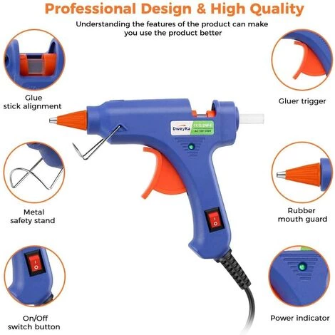 Préchauffage Rapide:pistolet à colle chaude 20W fabriqué avec thermistance PTC intégrée de haute technologie,donc il suffit de chauffe en 3-5 minutes.Le contrôle intelligent de la température le maintient à la température de 165℃ .