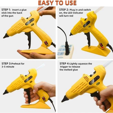Facilité d’utilisation: Premièrement, Insérez le bâtonnet de colle à l’arrière; Branchez le câble dans une prise murale (LED rouge indiqué); Attendez que la colle chauffe; Finallement, appuyez sur la gâchette pour faire couler la colle-4 étapes applicables, bien parfait pour debutant ou amateur