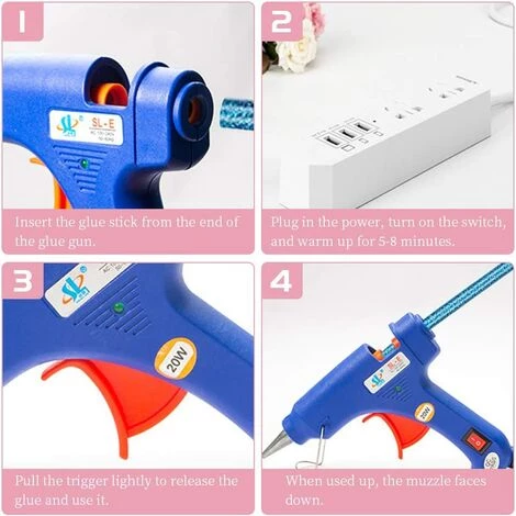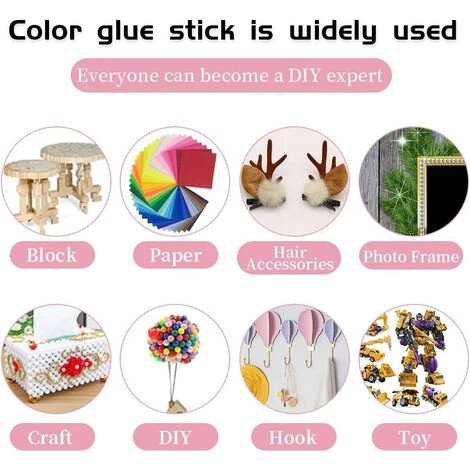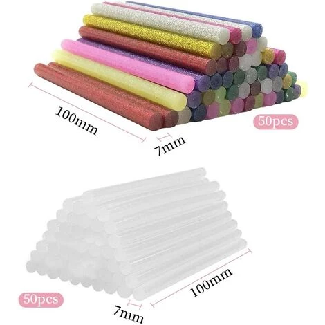 Emballage inclus : 50 bâtons de colle chaude Ultra Clear (7 mm x 100 mm) et 50 bâtons de colle chaude colorés scintillants (7 mm x 100 mm). Attention: convient aux pistolets à colle 20:30W (mini pistolet à colle). Veuillez vous assurer que la surface adhésive est sans eau, sans poussière et sans huile pour le meilleur effet.